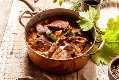 - Faire mariner la viande coupée en gros dés dans le vin avec les clous de girofle, la noix de muscade, le thym, le laurier, les oignons épluchés et coupés en huit, le sel aromatisé, le poivre et 8cl d'huile d'olive Fruitée pendant 48 heures.