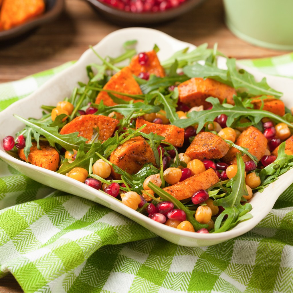 Préparez votre assiette : ajoutez la salade, les cubes de patate douce, les pois chiches, la grenade, les noisettes et le bleu de brebis émietté.