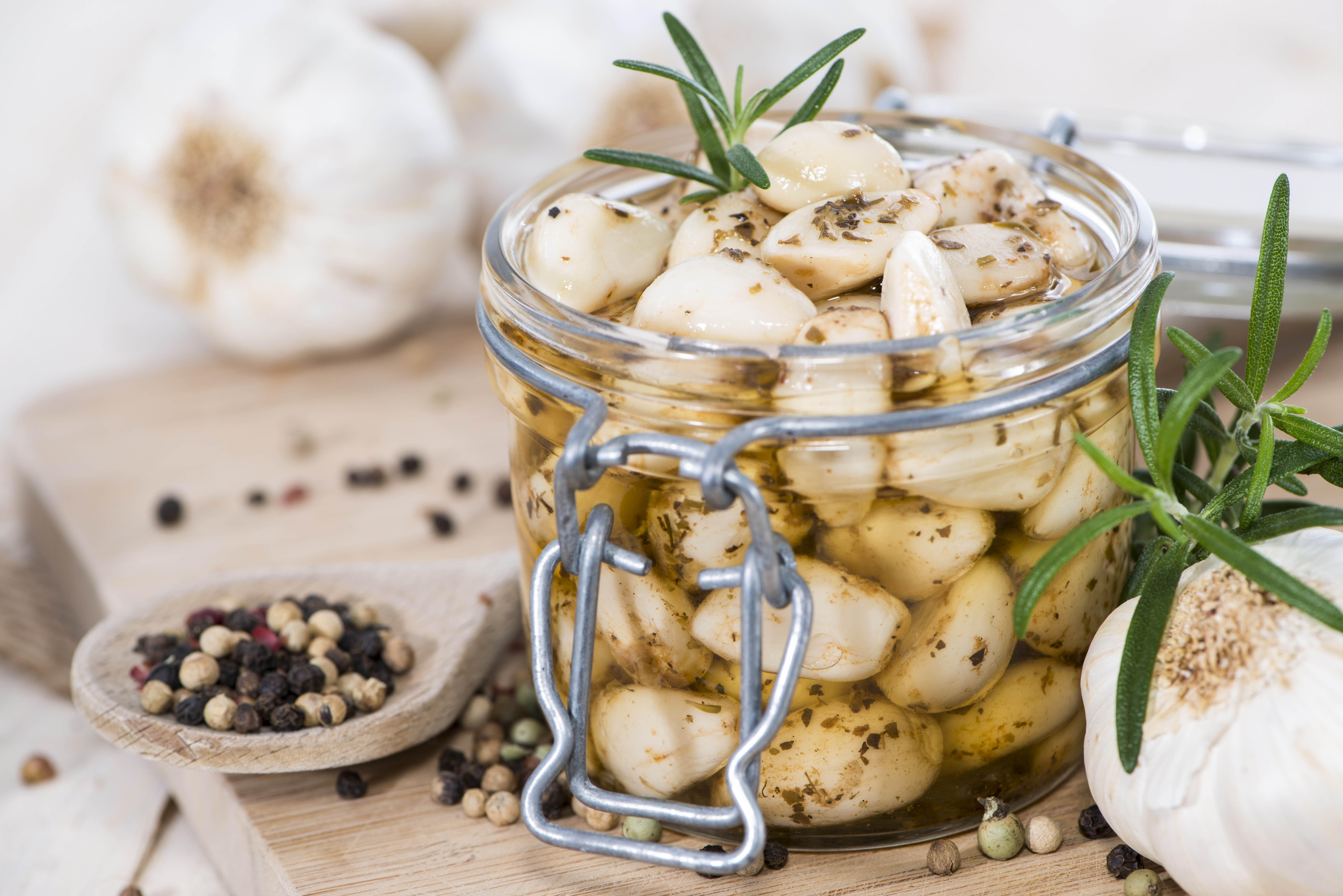 60 cl d'huile d'olive BIO Caractère 2 têtes d'ail nouveau 4 feuilles de laurier 2 branches de romarin 2 branches de thym 1 c. à café de poivre noir en grains