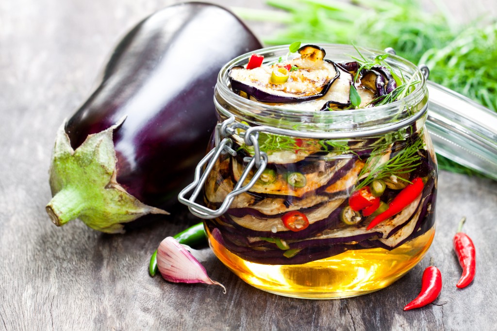 Découpez vos chilis en petites rondelles et hachez l’ail finement. Une fois vos aubergines cuites, disposez-les dans un bocal en répartissant l’ail et les chilis entre vos tranches. Ajoutez les brins de thym, de romarin et les baies roses, puis recouvrez d’huile d’olive.