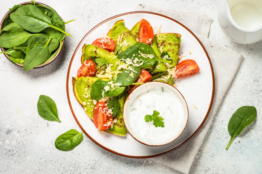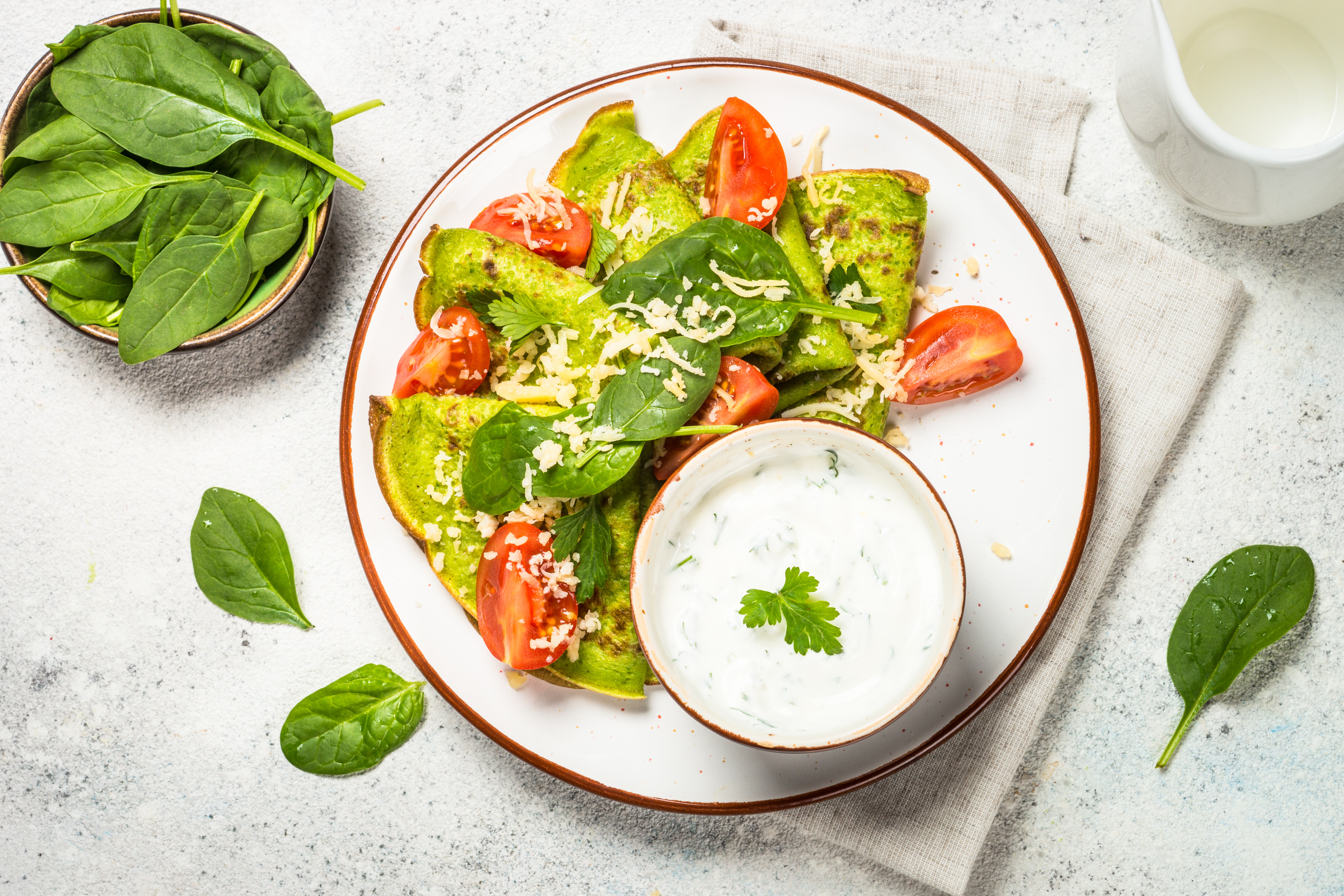 Garnissez les crêpes avec des produits de votre choix ou par exemple avec de la crème fraîche végétale, du houmous, des jeunes pousses d’épinards, des tomates cerises, des pois chiches, de l’oignon rouge, du persil frais et un peu de sel et de poivre.