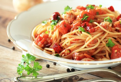 - Lorsque les spaghettis sont al dente, couper le feu avant de les égoutter. Dans un grand plat, verser les spaghettis accompagnés de la sauce, y ajouter une pincée de poivre puis remuer.