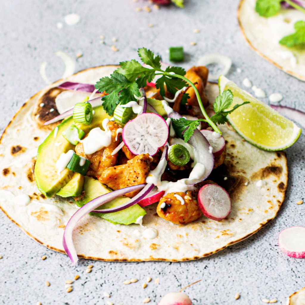 Recette de Tacos maison de poulet grillé, avocat, oignons rouges, radis & citron